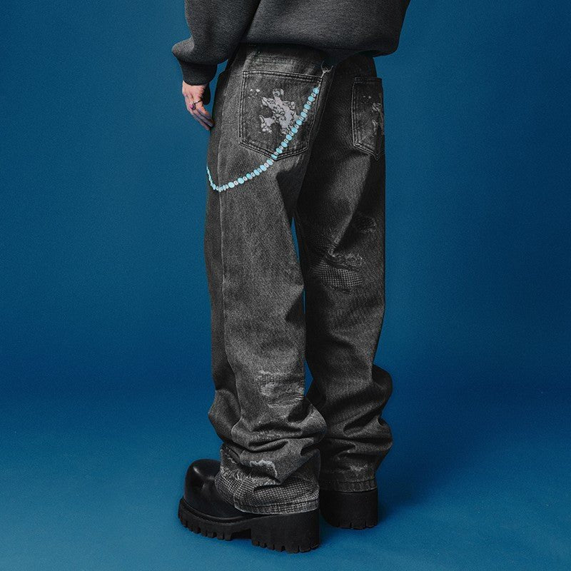 Add some edge to your everyday style with our Chain Relief Print Jeans. Made from high-quality denim, these jeans have a cool chain design printed on them, giving you that bold street look. They're comfy, strong, and perfect for standing out while keeping it casual.