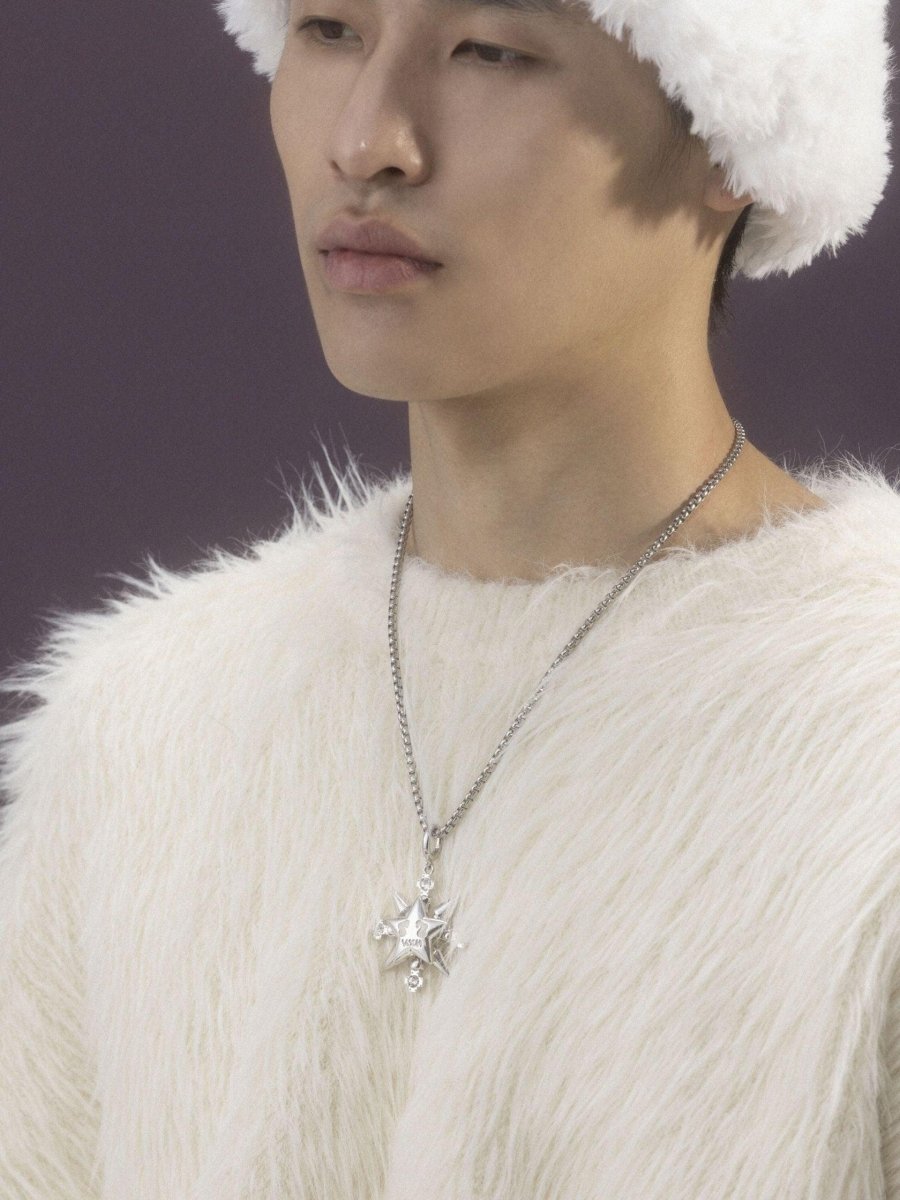 VSCH cable chain necklace in silver, double layered star graphic and crystals at face, lobster-clasp fastening.