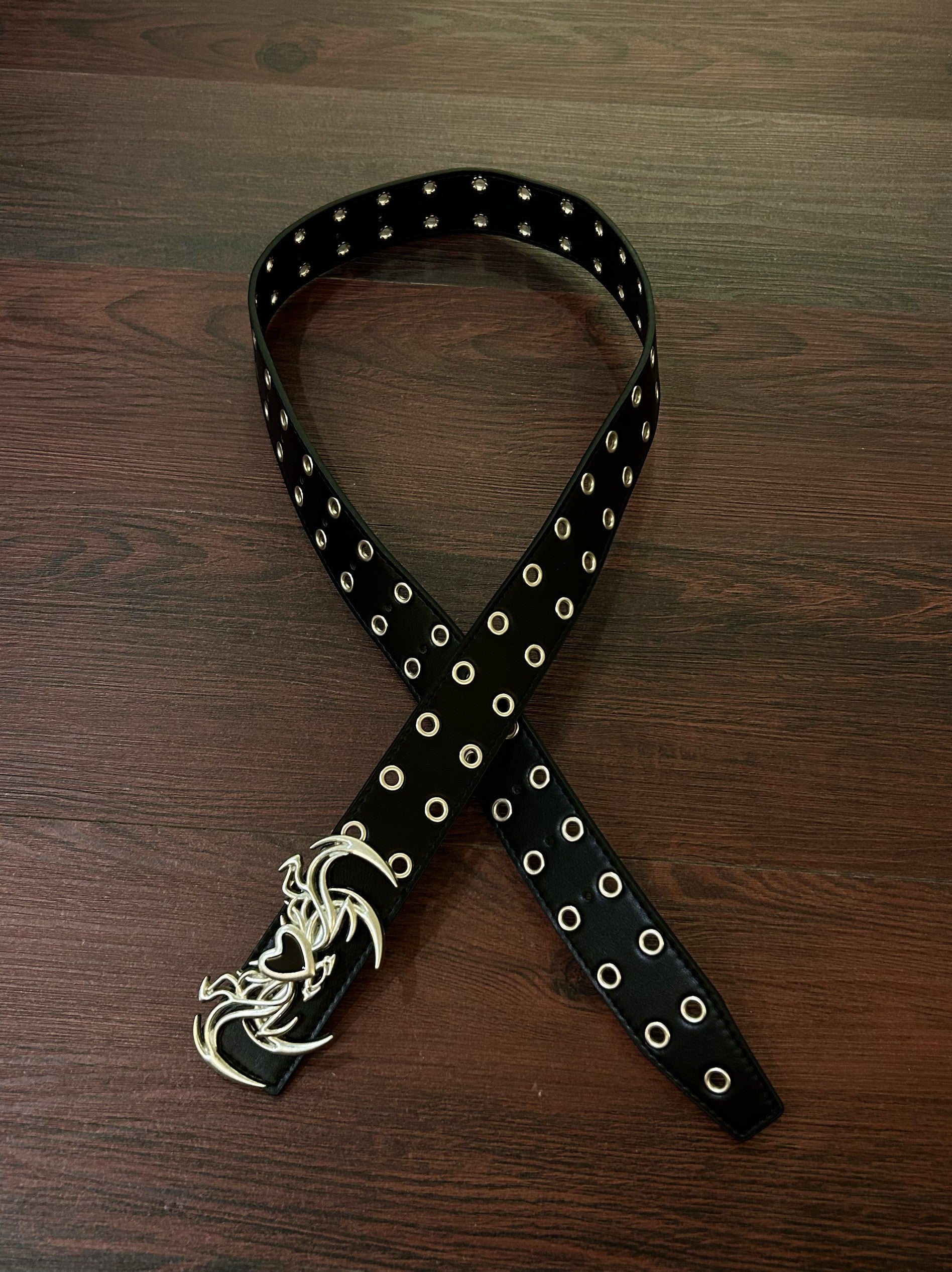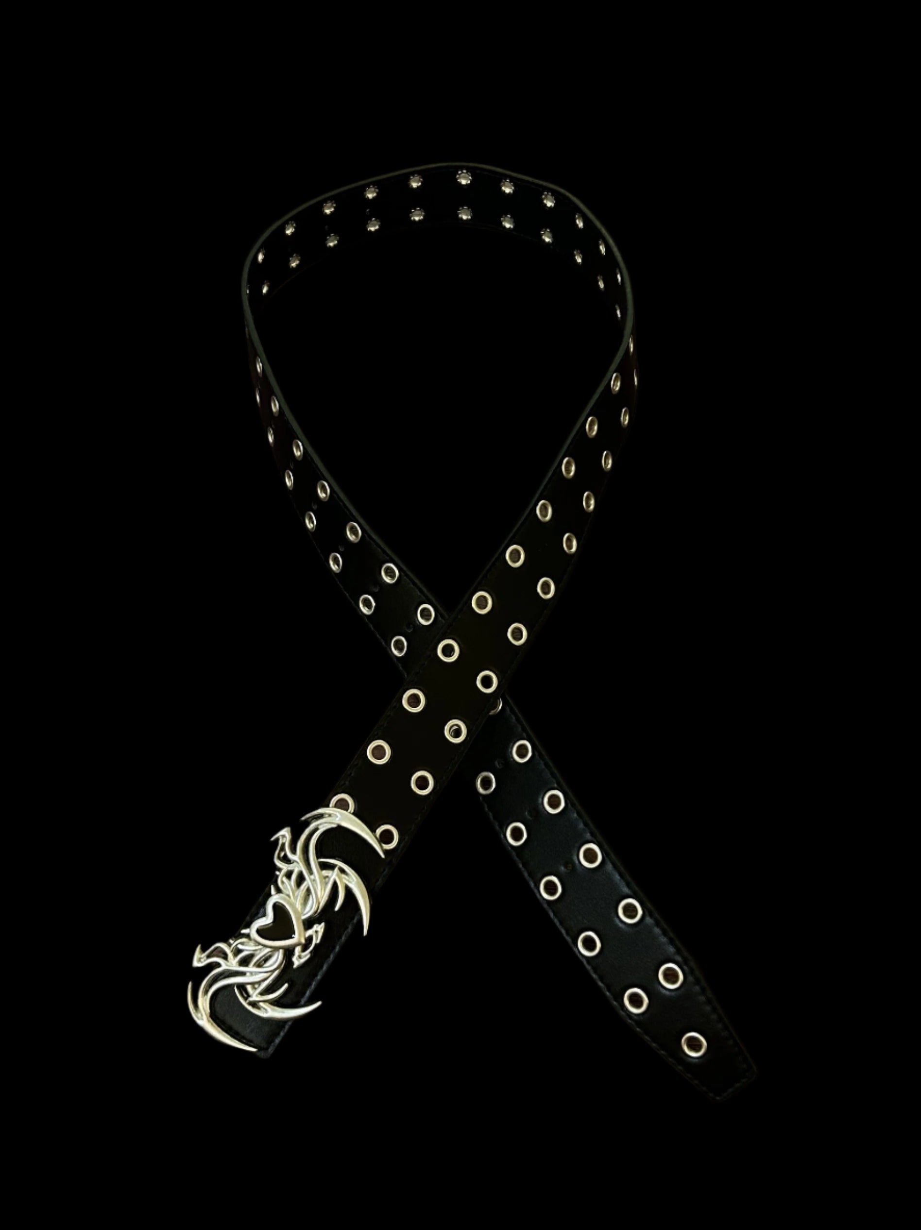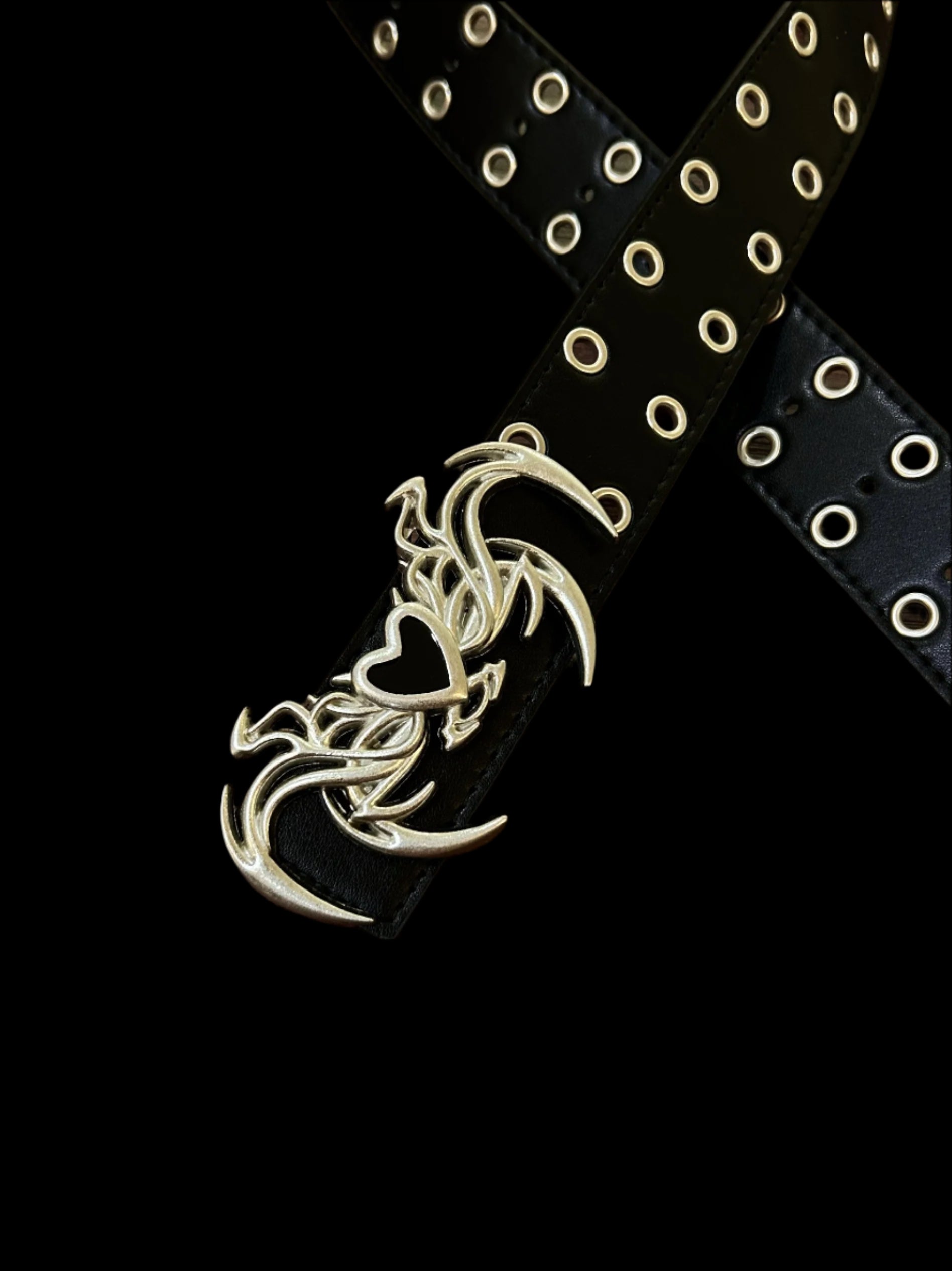 Style Details: Black grommet strap with a sharp heart-and-thorns buckle.
