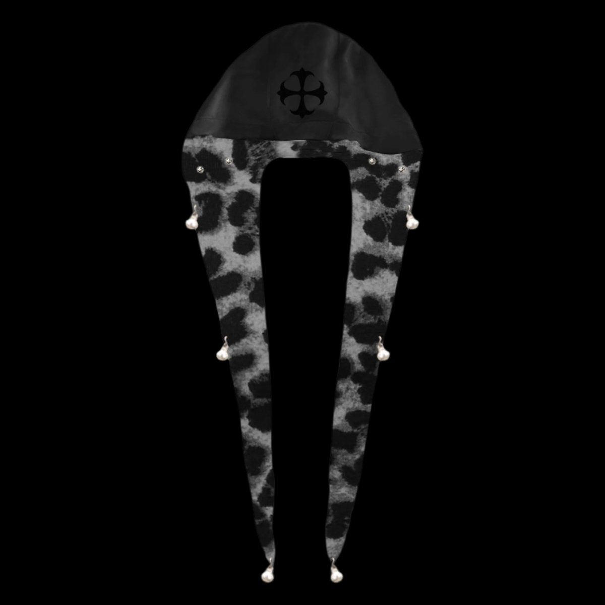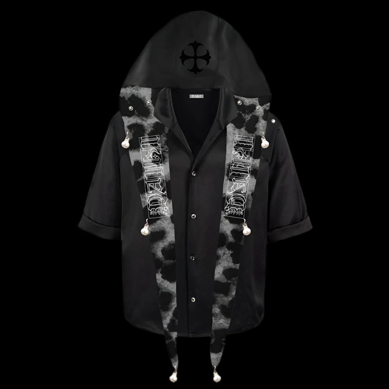 - Style Details: Sleek black shirt with a bold detachable leopard-print hoodie.