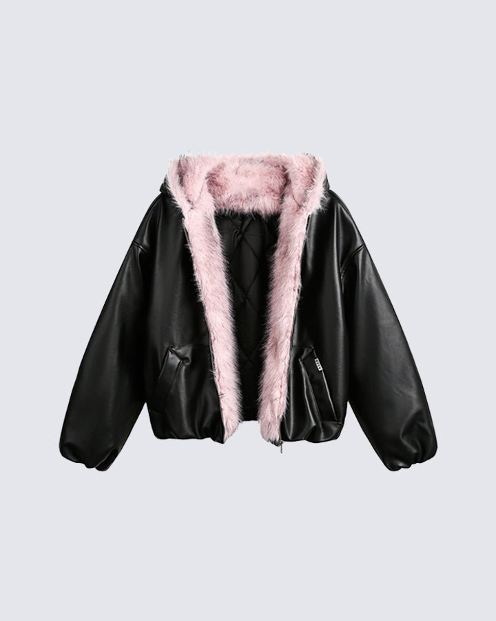PU Leather Fur Collar Hooded Jacket - Dekayed