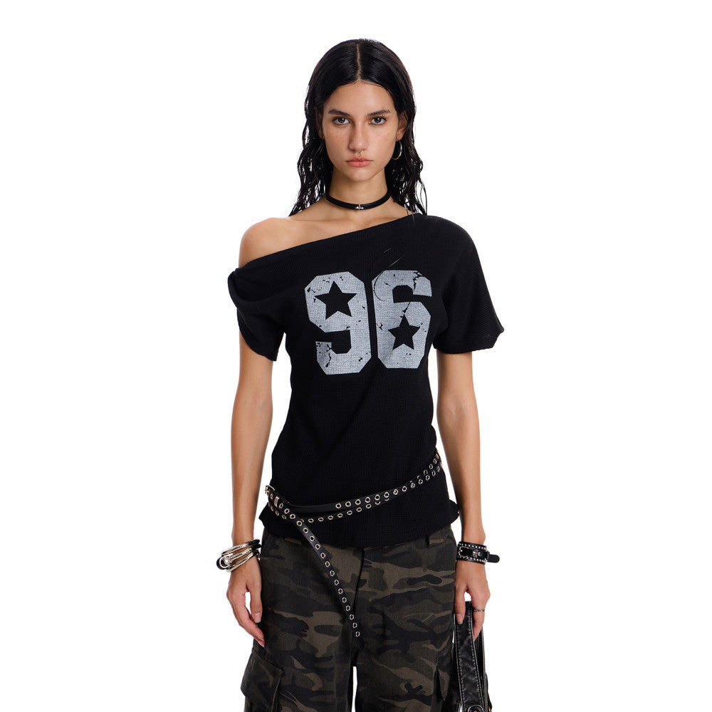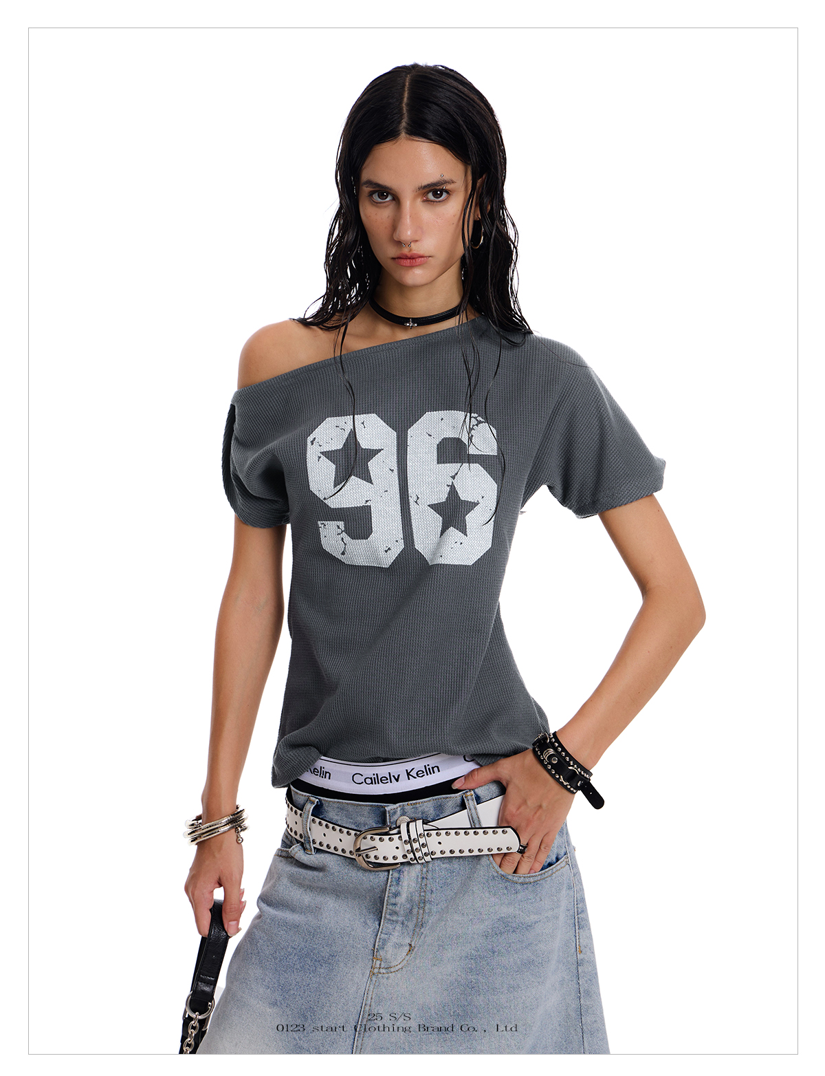 - Style: Off-Shoulder Streetwear Graphic Tee with Diagonal Collar